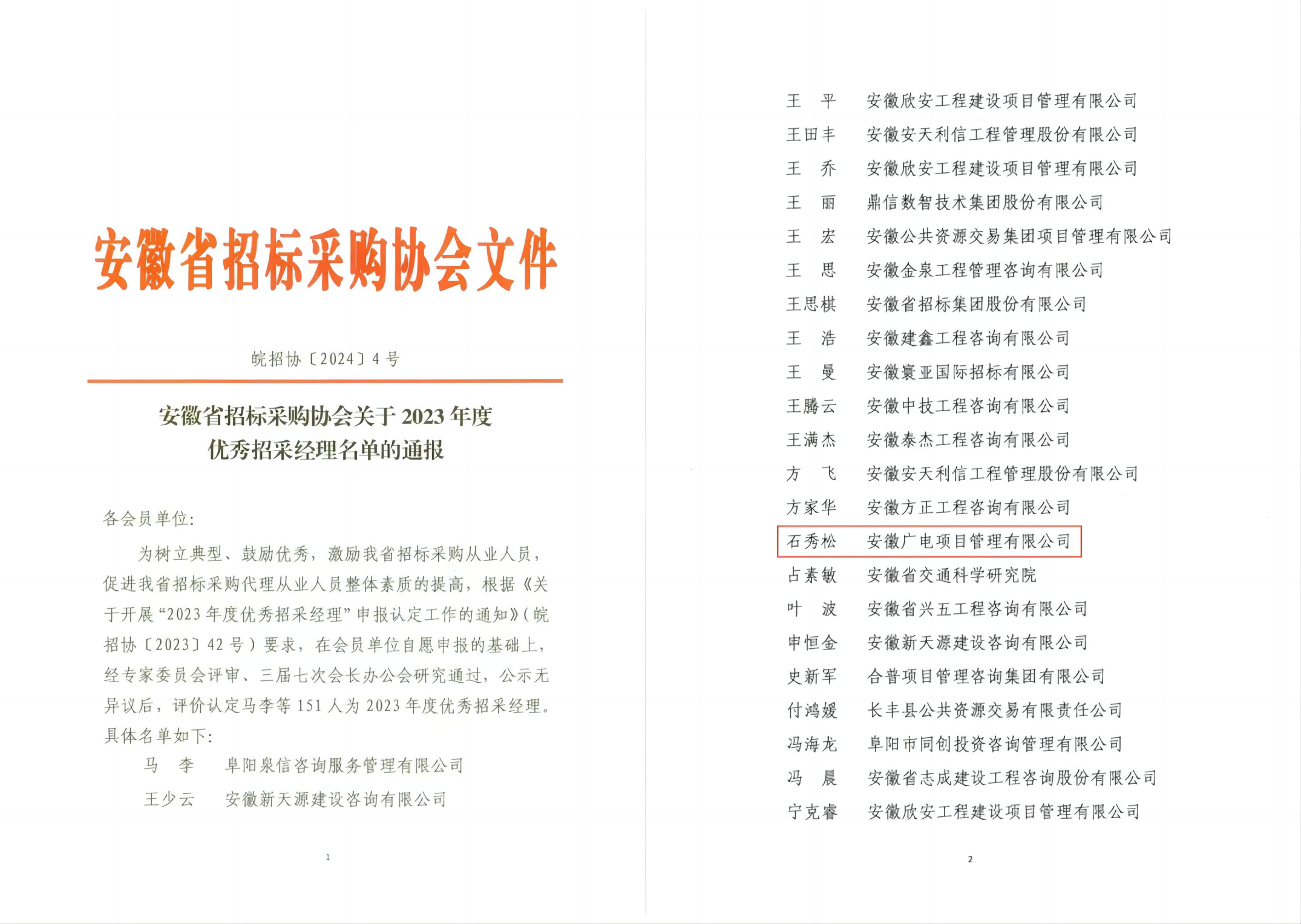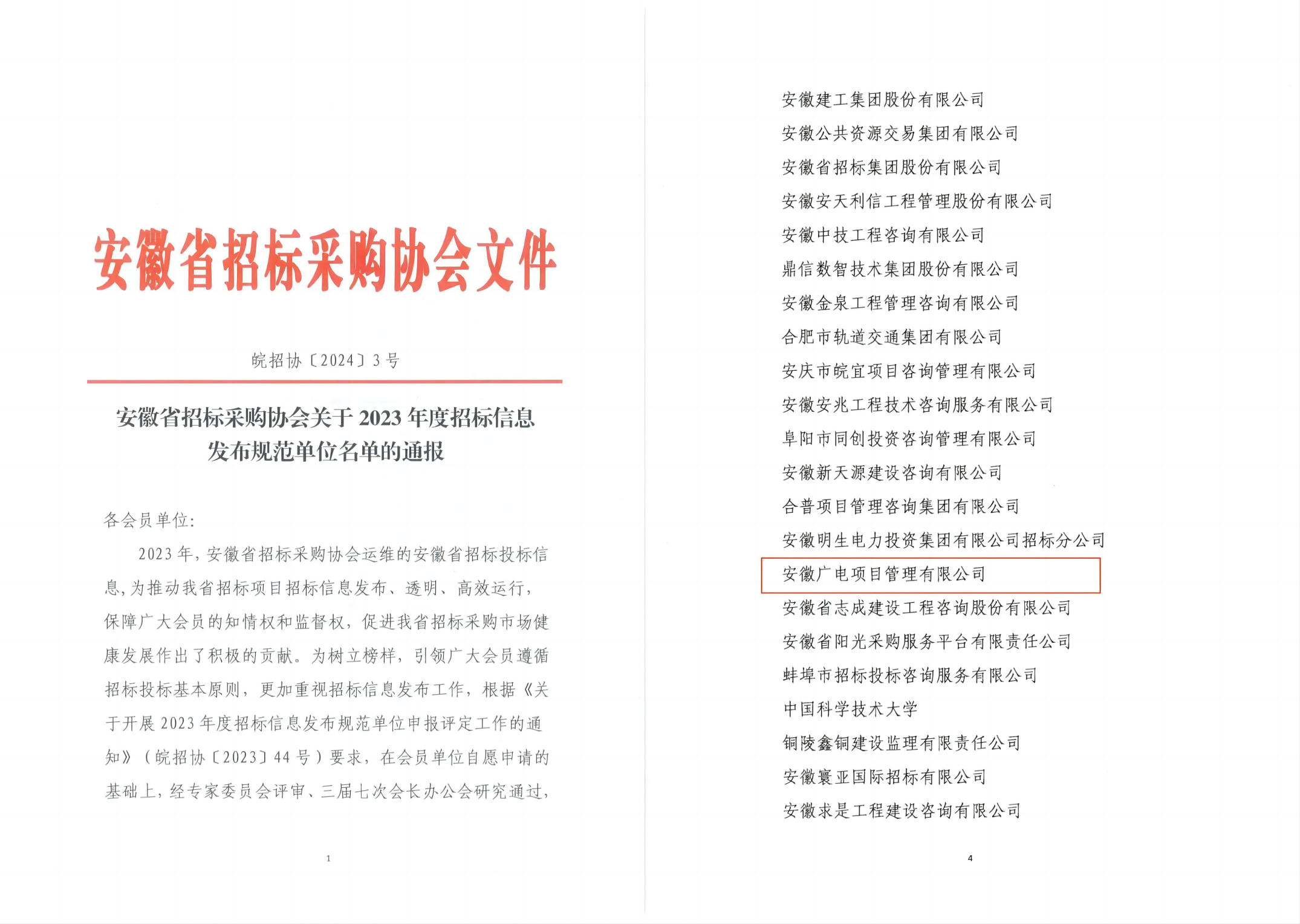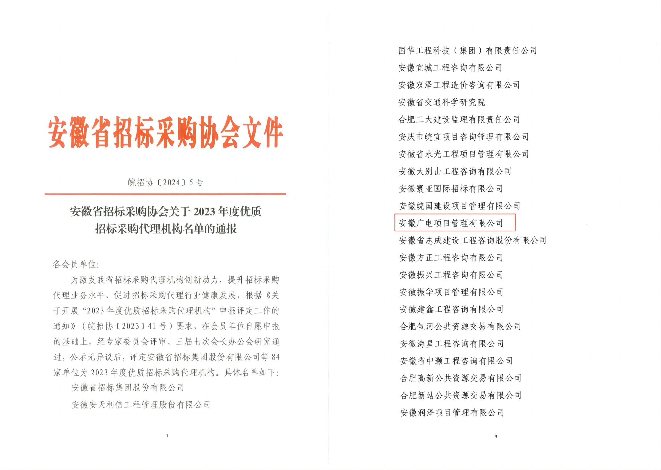 近期,安徽省招标采购协会发布了《关于2023年度优质招标采购代理机构名单的通报》《关于2023年度招标信息发布规范单位名单的通报》《关于2023年度优秀招采经理名单的通报》,安徽广电项目管理有限公司连续三年获评“年度优质招标采购代理机构”荣誉称号、连续两年获评“年度招标信息发布规范单位”荣誉称号,彭峰、李渊、石秀松三人荣获“2023年度优质招采经理”称号。以上殊荣是对广电项管综合发展实力、专业服务水平和技术人才质量的充分肯定,进一步提升了广电项管在省内招投标领域的良好形象和品牌知名度。