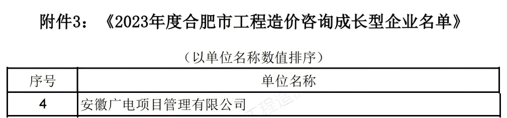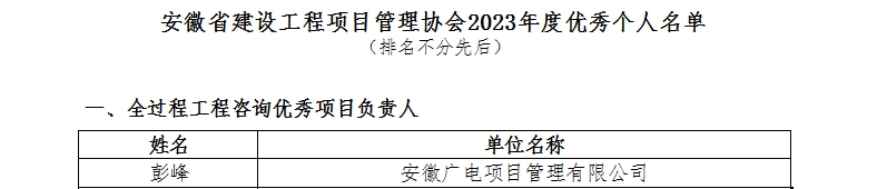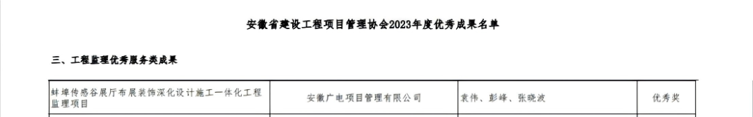 近期,安徽省建设工程项目管理协会、合肥市建设工程造价协会发布关于2023年度工程咨询领域评优结果通知,安徽广电项目管理有限公司分别获评“年度优秀造价企业”“年度合肥市工程造价咨询成长型企业”及多项优秀个人及服务成果奖项。