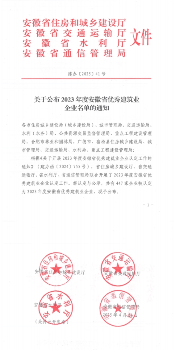 “安徽省优秀建筑业企业”由四大省级主管部门联合认定,权威性高、公信力强,是省内建筑业含金量最高的综合性荣誉之一。评审过程严格围绕企业社会责任履行、经营发展、管理创新、建造能力、文化建设等维度展开,经过多轮审核与专家评议,最终评选出行业典范。